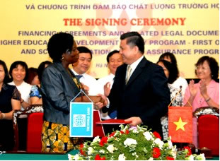 关于“第一阶段大学教育发展政策”计划,世界银行以开发政策贷款方式赞助5000万美金信用款并一年一次进行发放资金。 该计划的目的为协助越南政府展开 “大学教育改革”方案以现代化大学教育领域,满足高质量人力资源的需求为国家工业化、现代化事业服务。