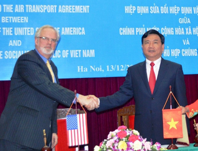 交通运输部部长丁罗升与美国驻越大使大卫·希尔——图片:VGP 12月13日下午,越南交通运输部部长丁罗升与美国驻越大使大卫·希尔(David Shear)签署了越南政府与美国政府之间的航空运输协定修改协议。
