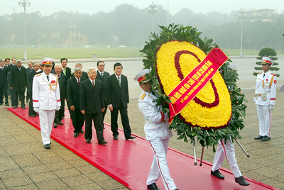 各位党、国家及越南祖国阵线领导人到胡志明陵墓敬献了花圈并上香缅怀胡志明主席 图片:VGP |