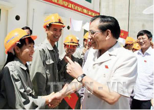 农德孟总书记及太原省国会代表团6月24日在太原省军事指挥部和越南工业建设总公司所属光山水泥厂接触选民。听取国会代表报告国会第十二届第五次会议的结果之后,其军事指挥部的选民建议党委和政府各级应更加重视建设全民国防与人民安全的阵势。