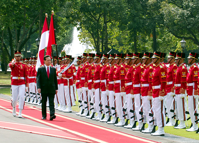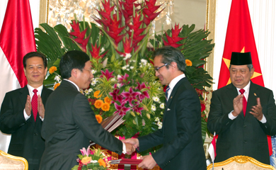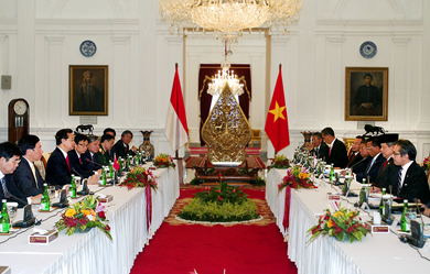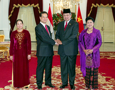 会上,印尼总统苏西洛•班邦•尤多约诺已热烈欢迎阮晋勇总理、夫人以及越南政府高级代表团并表示越南政府代表团的此次访问将有利于进一步巩固及深化两国传统友谊和全面合作关系。
