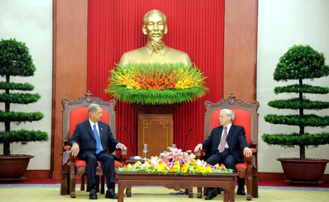 阮富仲总书记8月28日下午在党中央总部会见正在访越的塞舌尔总统詹姆斯 · 阿里克斯 · 米歇尔(James Alix Michel)。