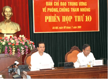 7月8日早 中央反贪指导委员会召开第十次会议目的为评估2009上半年反贪工作结果及部署下半年的任务。反贪指导委员会主任阮晋勇总理以及副主任张永仲副总理主持会议。