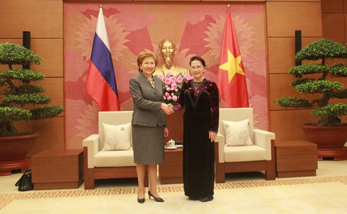 重申越南一向重视、优先巩固和增强与俄罗斯联邦的全面战略合作伙伴关系,愿促进各领域的合作,阮氏金银主席对两国不断得到巩固的政治互信表示高兴,维持各级代表团尤其是高层的互访。阮氏金银主席对越俄在包括联合国在内的各个多边论坛上的密切协调与配合给予了高度评价,阮氏金银主席建议俄罗斯联邦支持越南当选2020-2021年联合国安理会非常任理事国。