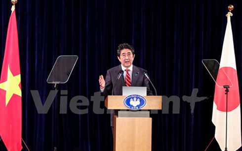 谈到两国经济合作,安倍晋三表示,随他访问越南有76家日本企业,其中包括建筑、科技、物流等行业的企业,他们已经在越南站稳脚跟。安倍晋三强调,充满活力的亚太地区是日本增长动力,日本愿与亚洲各国共享繁荣。