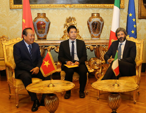 与意大利众议院议长罗伯特·菲科交谈时,张和平副总理强调,越南—意大利在政治、经贸投资、文化、教育、科技、司法、环境等各个领域的战略伙伴关系在保持良好发展态势。特别是2018年,两国建交45周年和建立战略合作伙伴关系5周年纪念,两国举行系列丰富活动。
