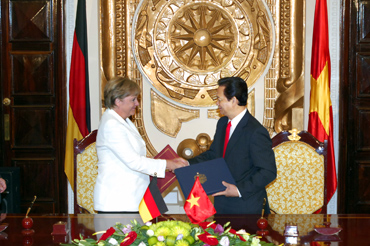 2011年10月11日越南总理阮晋勇与到访的德国总理默克尔在河内签署河内声明,两国领导人一致同意将双边关系提升为战略伙伴关系。图片:VGP |