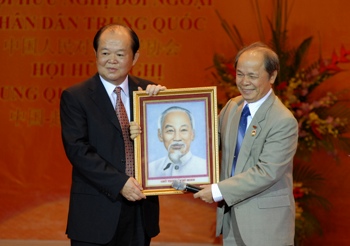 原赴华越南留学生范道将胡志明主席画像赠送给黄铮教授(左)——图片:政府门户网站 |