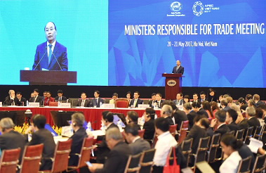 阮春福总理强调,APEC贸易部长会议是APEC合作框架内最为重要的专业部长会议之一。阮春福总理相信,在成员国部长和世贸组织总干事阿泽维多积极参与的情况下,会议将对APEC2017各项主题和优先事项的开展过程进行梳理并通过成员国所提出的倡议,供即将于2017年11月召开的APEC峰会讨论用,旨在引领APEC走向美好的未来。