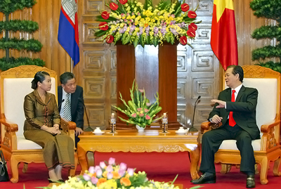 会见柬埔寨政府常务副首相梅森安时,阮总理重申越方非常重视与柬埔寨共同努力推进双方在政治、外交、经济、国防安全、文化等各领域的关系不断向前发展并为两国、两国民族带来务实利益 。