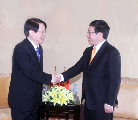 4月19日上午,越南政府副总理兼外交部部长范平明在顺化市会见了正在越南承天顺化出席东盟-中日韩文化部长会议的中国文化部部长蔡武。