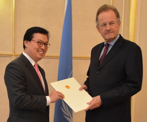 越南常驻联合国日内瓦办事处和瑞士其他国际组织代表团特命全权大使杨志勇向联合国驻日内瓦总部办事处总干事莫勒递交国书 |