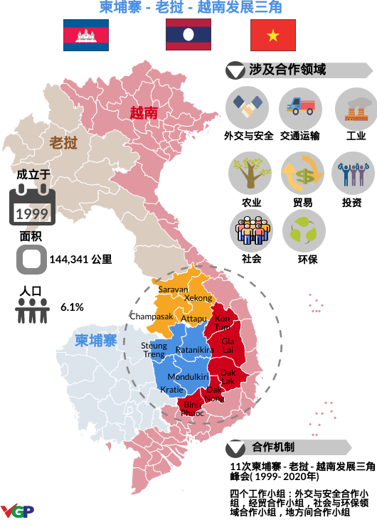 (VGP)柬埔寨,老挝和越南三国发展三角区成立于1999年,旨在加强柬老越三国团结合作,维护政治稳定和安全,推进减贫工作,推动该地区经济社会发展。