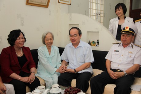 值此之际,阮善仁副总理看望慰问了阮文律烈士家庭并赠送礼物,阮文律上校为海军126旅的政委,于1979年1月26日在柬埔寨牺牲;看望并激励住在胡志明市第4郡第12坊段如好街15/7A的阮文香伤员,73岁,海军“无号船”的老战士,参加了16趟南部战场运输补给支援。
