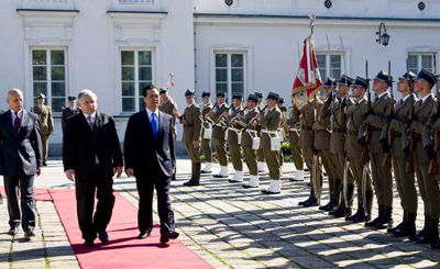 2007年9月,波兰总理雅罗斯瓦夫卡钦斯基迎接政府总理阮普勇 图片:VNA