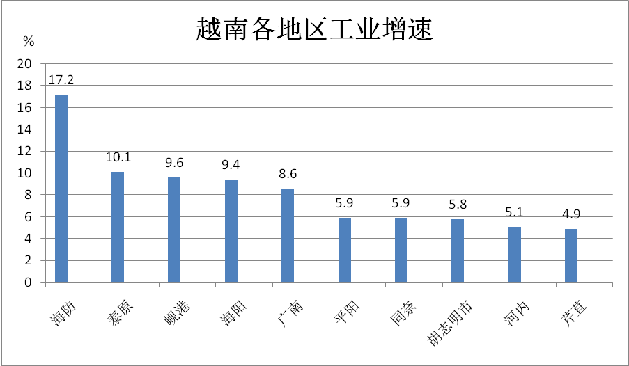 海防工业增长速度达17.2%,居全国首位,太原省工业增速10.1%,岘港9.6%,胡志明市工业增速5.8%,河内5.1%。