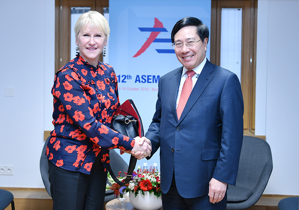 会见瑞典外交部长玛戈特瓦尔斯特伦时,范平明副总理重申,越南一向重视与瑞典的关系。双方同意应更加努力实现2020年双边贸易额达20亿美元的目标。范平明副总理建议,除了目前合作的领域,瑞典协助越南大力推进绿色能源、可再生能源、电信等高科技应用于生活。双方同意将于明年举行两国建交50周年纪念系列活动。