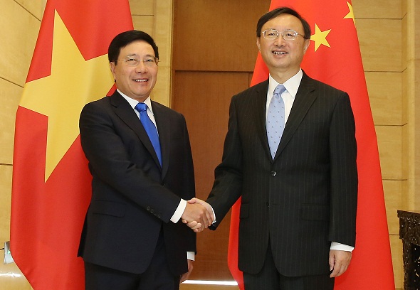 越南政府副总理兼外交部长范平明与中国国务委员杨洁篪合影