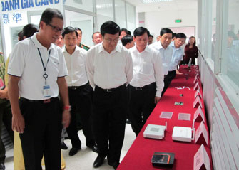 政治局委员、党中央书记处常务书记张晋创到访设在桂武工业区的鸿海科技集团的电子零配件安装、生产厂——图片:北宁报 |