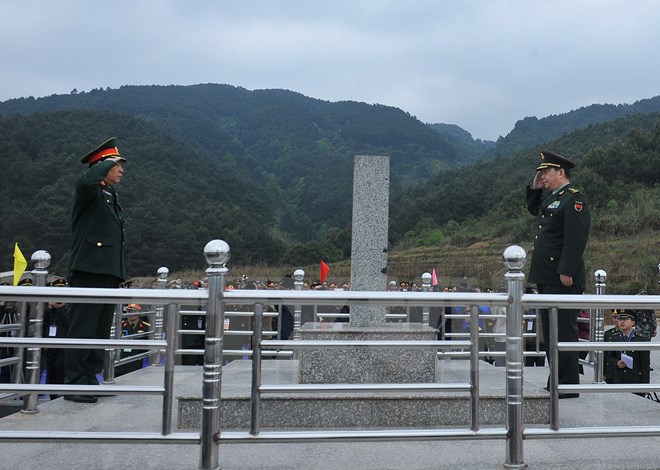 越南国防部长冯光青一行与中国国务委员兼国防部长常万全在峙马口岸1223号界碑处,观摩越中边防部队联合巡逻