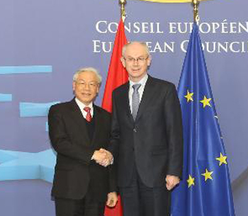 在与越共中央总书记举行会谈上,欧盟理事会主席范龙佩高度评价越南改革开放政策以及越南这些年来所取得成就,并表示希望巩固和加强欧盟—越南的友好合作关系。