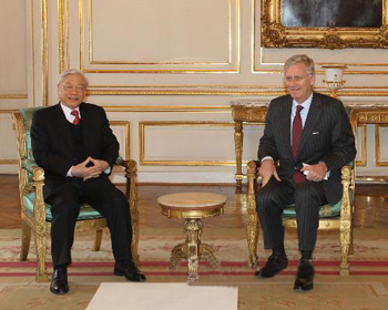 越共中央总书记阮富仲(左)与比利时王储菲利普王子 |