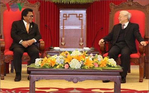 乌斯曼•萨布达主席向阮富仲总书记通报他代表团与越南国会代表团的良好工作结果,并高度评价越南的蓬勃发展,对越南印尼目前关系良好发展表示满意,肯定愿与越南加强各领域的友好合作关系,其中包括海上合作以维护和平稳定,符合于国际法以及两国与地区的利益。