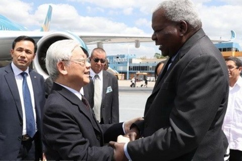 古巴人民政权代表大会(议会)主席埃斯特万·拉索·埃尔南德斯以及古巴党、政府多名官员到机场迎接阮富仲总书记——图片:人民报 |