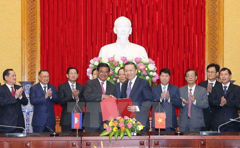 苏林部长与柬埔寨副总理兼内政部长邵肯签署合作协议——图片:越通社 |