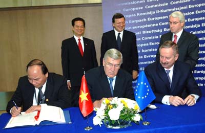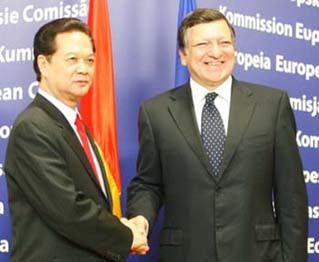 阮晋勇总理趁来比利时王国布鲁塞尔首都参加第八届亚欧首脑会议(ASEM-8)之际专程访问了欧盟委员会并与欧盟委员会(EC)主席若泽曼努埃尔巴罗佐(Jose Manuel Barroso)举行会谈。