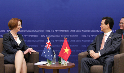 出席2012年3月27日在韩国首都首尔举行的第二届核安全峰会期间,阮晋勇总理(右)会见澳大利亚总理吉拉德——图片:VGP |