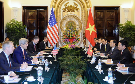 卿约翰·克里国务卿高度评价越南在谈判泛平洋战略经济伙伴关系协定进程所作出的决心和努力;并肯定美国将呼吁各方早日结束TPP谈判进程的决心;承诺将大力促进展开清除在岘港和边和机场的橙剂污染项目。卿约翰·克里先生肯定为越南农产品等商品扩大市场;重申美国随时协助越南应对气候变化。