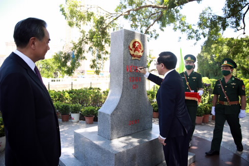 两国外长共同现场查看了边界界碑,并为各自的第一块界碑描红 |