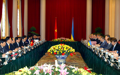 国家主席阮明哲与乌克兰总统尤先科进行会谈——图片:政府门户网站 |