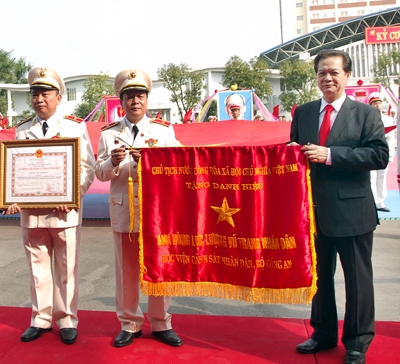 基于越南人民警察学院所取得巨大成就,今天本校师生荣获由越南国家主席所授予的“人民武装力量英雄”的称号和老挝人民民主共和国及柬埔寨王国授予的奖状。