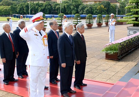 越共中央总书记阮富仲、前越共中央总书记黎可漂、前越共中央总书记农德孟、越南国家主席张晋创、国会主席阮生雄、前国会主席阮文安等党和国家领导人以及各位前中央政治局委员、书记处书记向胡志明主席陵敬献花圈,深切缅怀胡志明主席对党和民族革命事业的伟大功劳。