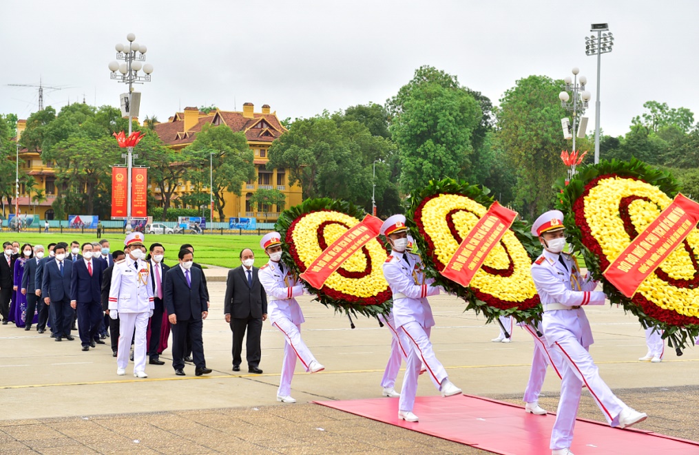 越南党、国家领导前往胡志明陵墓敬献花圈——图片:VGP/日北 |