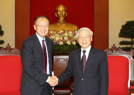 阮富仲总书记对世行过去以来为越南的经济社会发展及减贫事业所作出积极贡献给予高度评价;并表示,将快速和可持续发展经济、转变经济增长模式及调整经济结构相结合,提高其质量和效益、增强经济竞争力是越南党和国家所提的目标,其中,今至2020年,越南将集中精力促进经济增长模式转变,推进经济结构调整,力争至2020年将越南建成现代化工业国家。