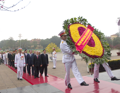越共中央总书记阮富仲、前总书记农德孟、国家主席张晋创、前国家主席陈德良、政府总理阮晋勇、国会主席阮生雄、前国会主席阮文安、祖国阵线中央委员会主席黄担、政治局各委员、党中央各位书记等到胡志明主席陵墓拜谒。