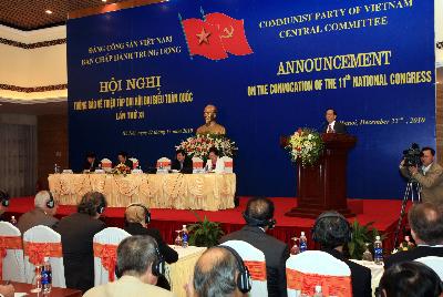 越南共产党第11次全国代表大会于2011年1月12日至19日召开,将讨论与通过党第10届中央委员会的政治报告;20年实施“社会主义过渡时期国家建设纲领”的总结报告和2011年补充、发展的“社会主义过渡时期国家建设纲领”;2001-2010年10年经济社会发展战略实施总结报告及2011-2020年10年经济社会发展战略;党章(修改、补充)。