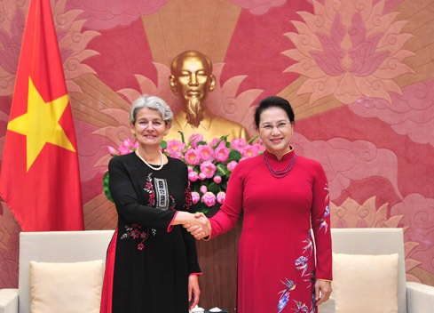 国会主席阮氏金银(右)会见联合国教科文组织总干事伊琳娜•博科娃。 |