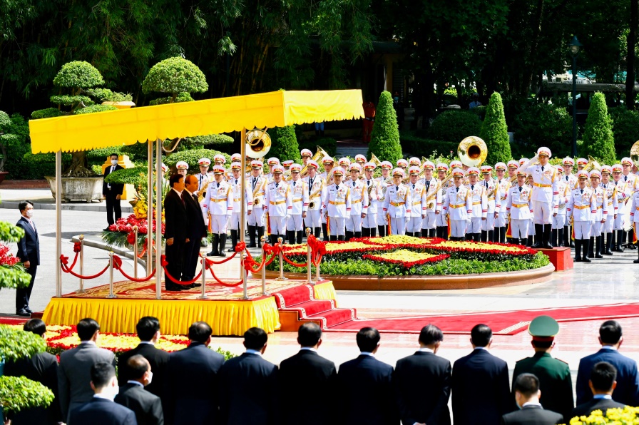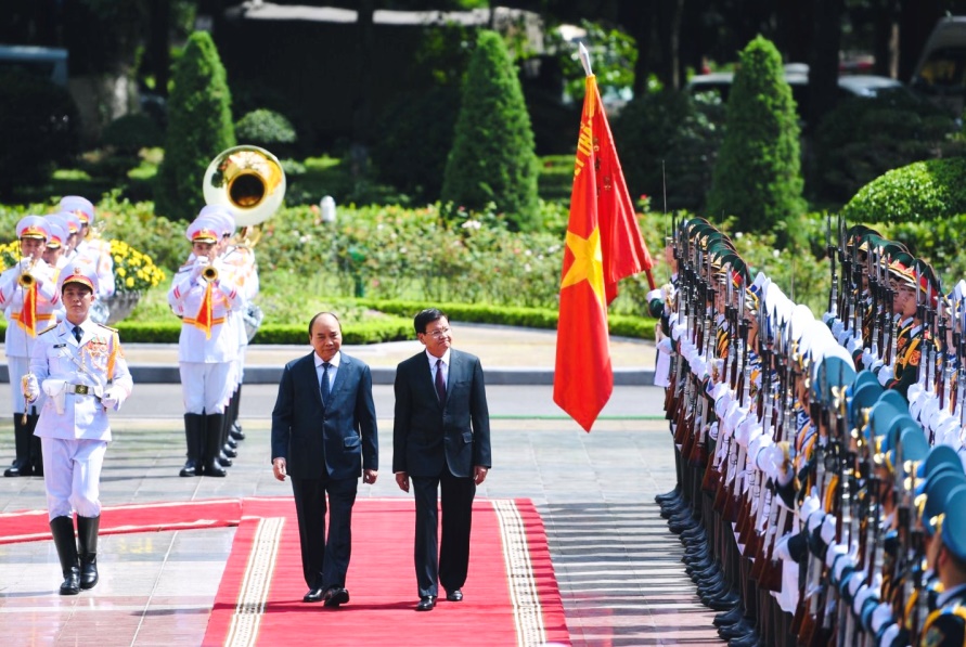 越南国家主席阮春福与老挝人民革命党中央总书记、国家主席通伦·西苏里检阅越南人民仪仗队——图片:VGP/日北 |