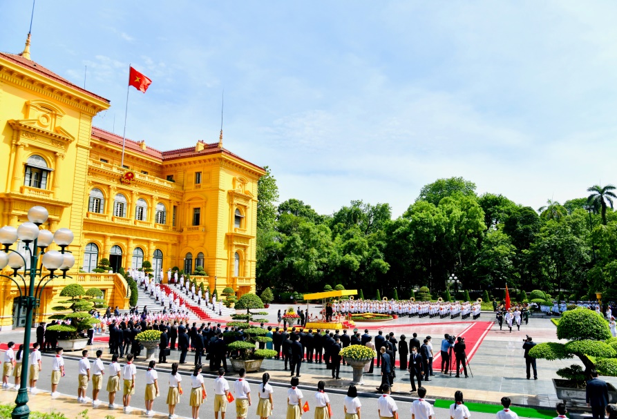 迎接仪式后,今日上午,越共中央总书记已与通伦·西苏里总书记、国家主席举行会谈。