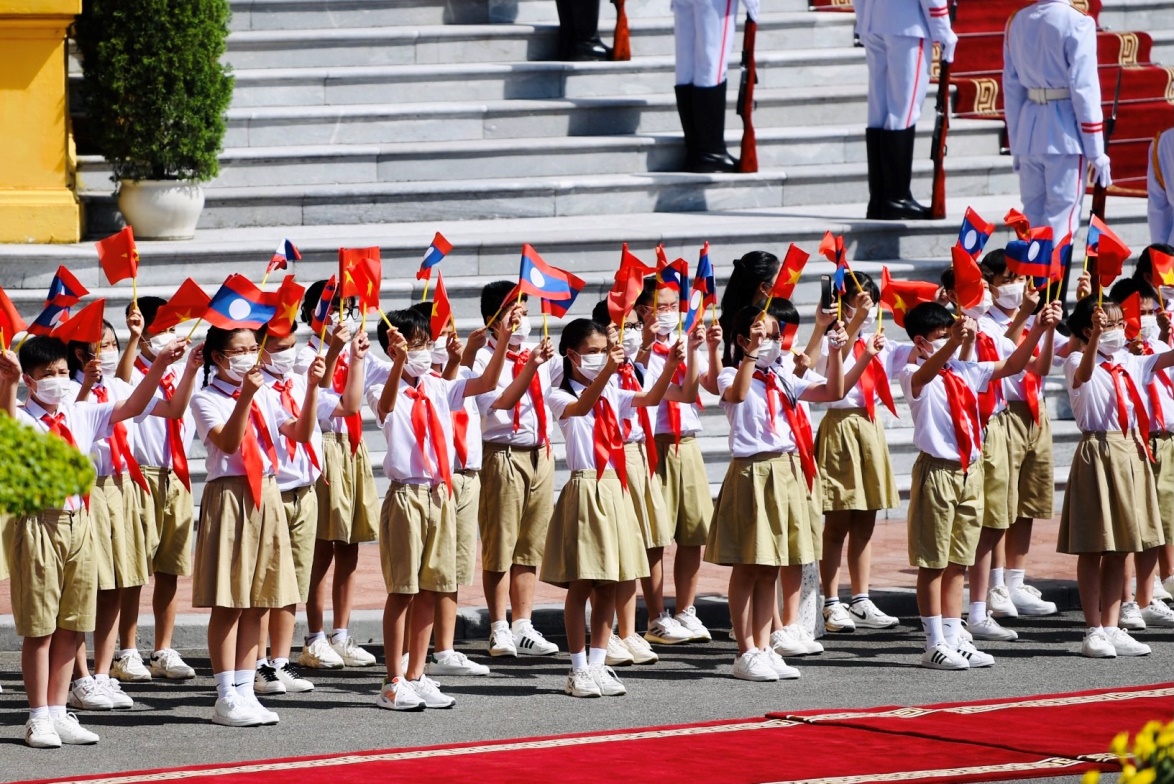 越南学生高举越南、老挝国旗迎接老挝总书记、国家主席和夫人一行到访——图片:VGP/日北 |