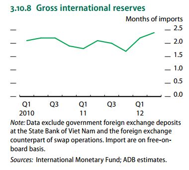 据亚洲开发银行10月3日发表的2012年亚洲发展展望更新报告,鉴于外资持续流入和国内汇率稳定,越南央行已扩大了外汇储备规模,目前越南外汇储备已足够支付2.4个月的进口额。