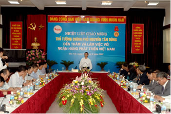 阮总理认为,开发银行作为政府在宏观经济执行的得力财政信用工具,实施发展投资信用、出口信用政策以便根据工业化现代化方向转换经济机构。