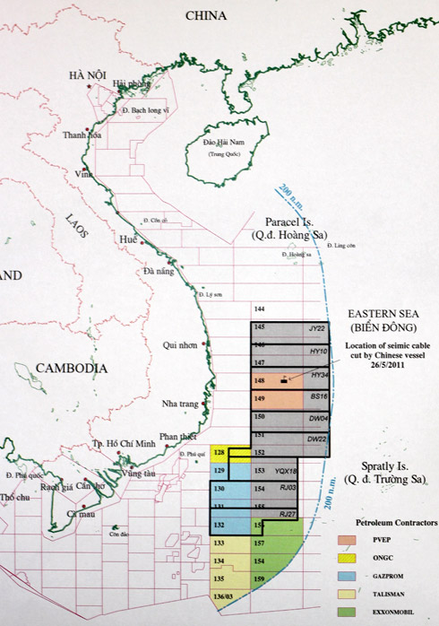 中海油2012年6月23日在属于越南专属经济区和大陆架范围内,离越南富贵岛最近的仅有13海里及离越南海岸大概60海里的JY 22、HY 10、HY 34、BS 16、DW 04、DW 22、YQ 18、RG 03、RJ 27等9个油田区块进行国际招标。