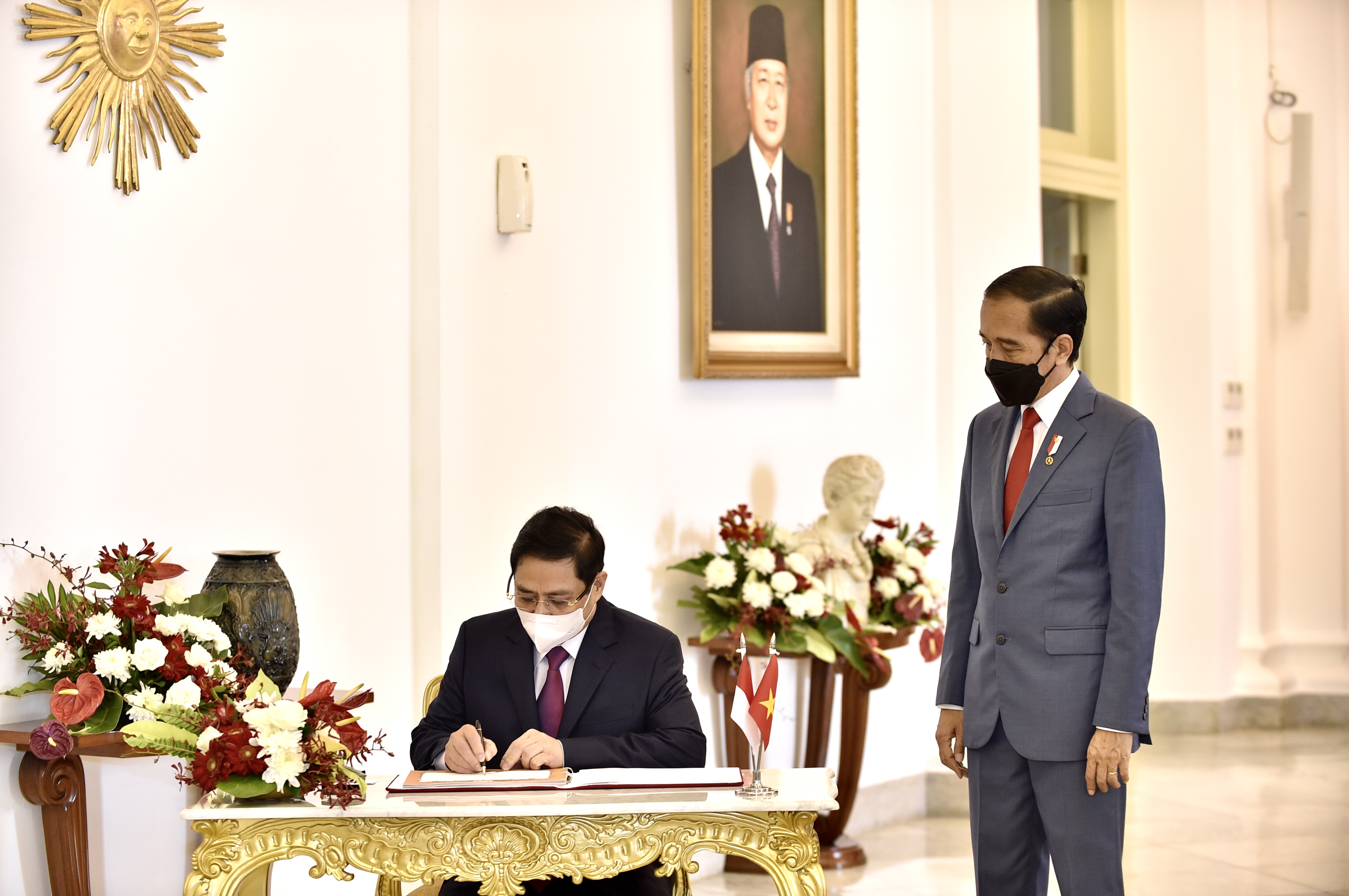 双边会晤在印尼总统府举行。范明正总理在纪念册上签名——图片:VGP/日北 |