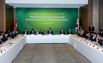 阮晋勇总理表示,发展越南 - 韩国友好合作关系是越南外交政策的优先方向之一。目前韩国对越南投资项目共3000个,投资总额达240亿美元,2011年双边贸易额约达180亿美元。