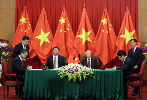 越共中央总书记阮富仲与中共中央总书记、中国国家主席习近平共同见证双边合作文件的签署